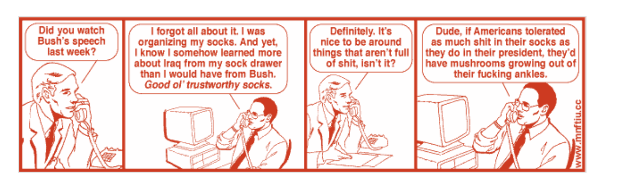 Back when George W. Bush was the president there was a cartoon published in Rolling Stone called Get Your War On. I absolutely loved it. It was created by a very clever, and funny guy named David Rees. The deeply sardonic cartoon used corny office clip art to sarcastically skewer Bush and his fundamentally stupid policies, including the ‘War on Terror.’ The cartoon ran from October 2001 to the end of Bush’s presidency in early 2009. I thought of it because as I recently finished Ben Burgis' book about Christopher Hitchens, it occurred to me how much we need the wit and wisdom of a guy like Hitch in these times. It then also occurred to me that I wish Mr. Rees was making a Trump era version of Get Your War On. Maybe he could call it Get Your Greed On? Or maybe Get Your Corruption On?
