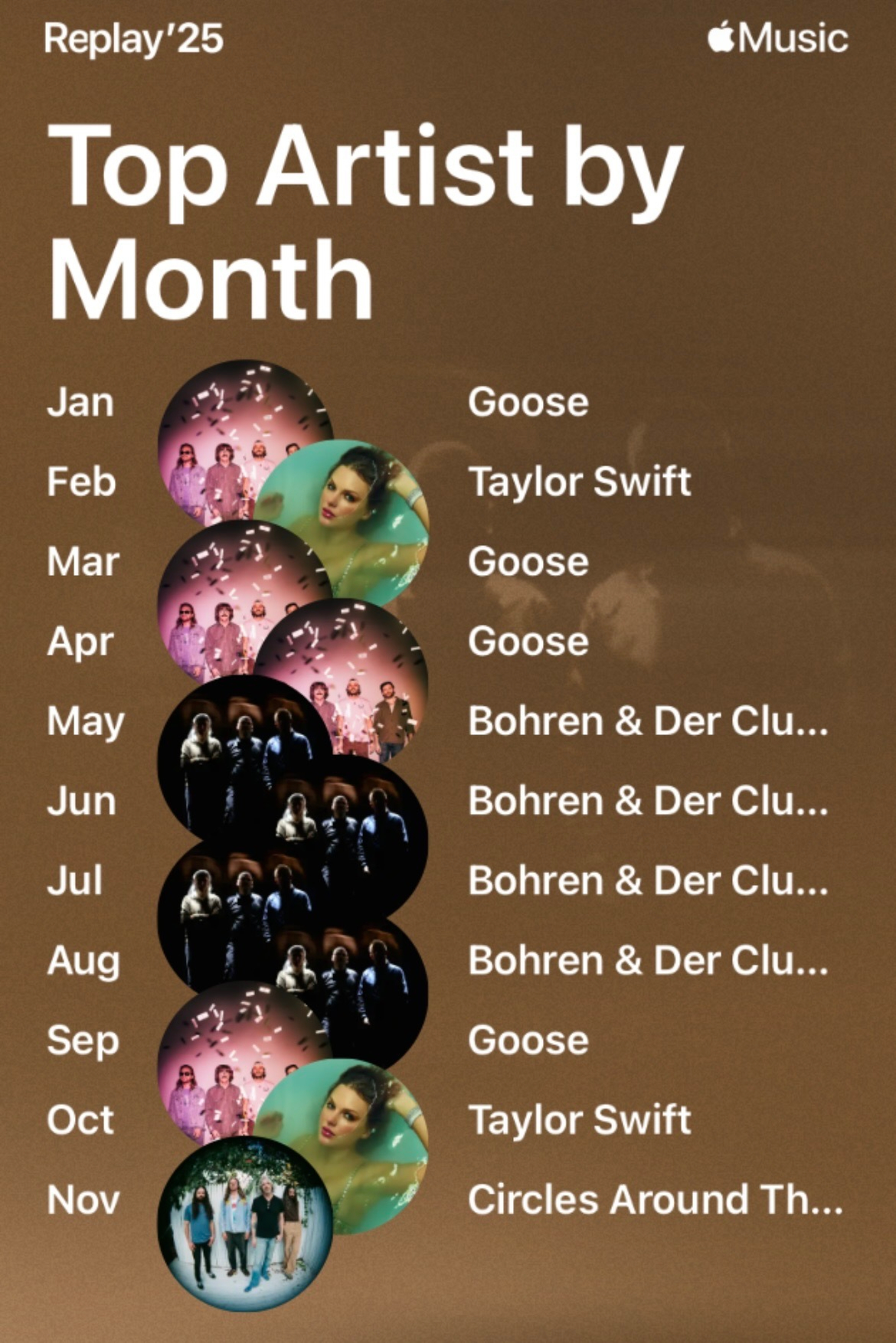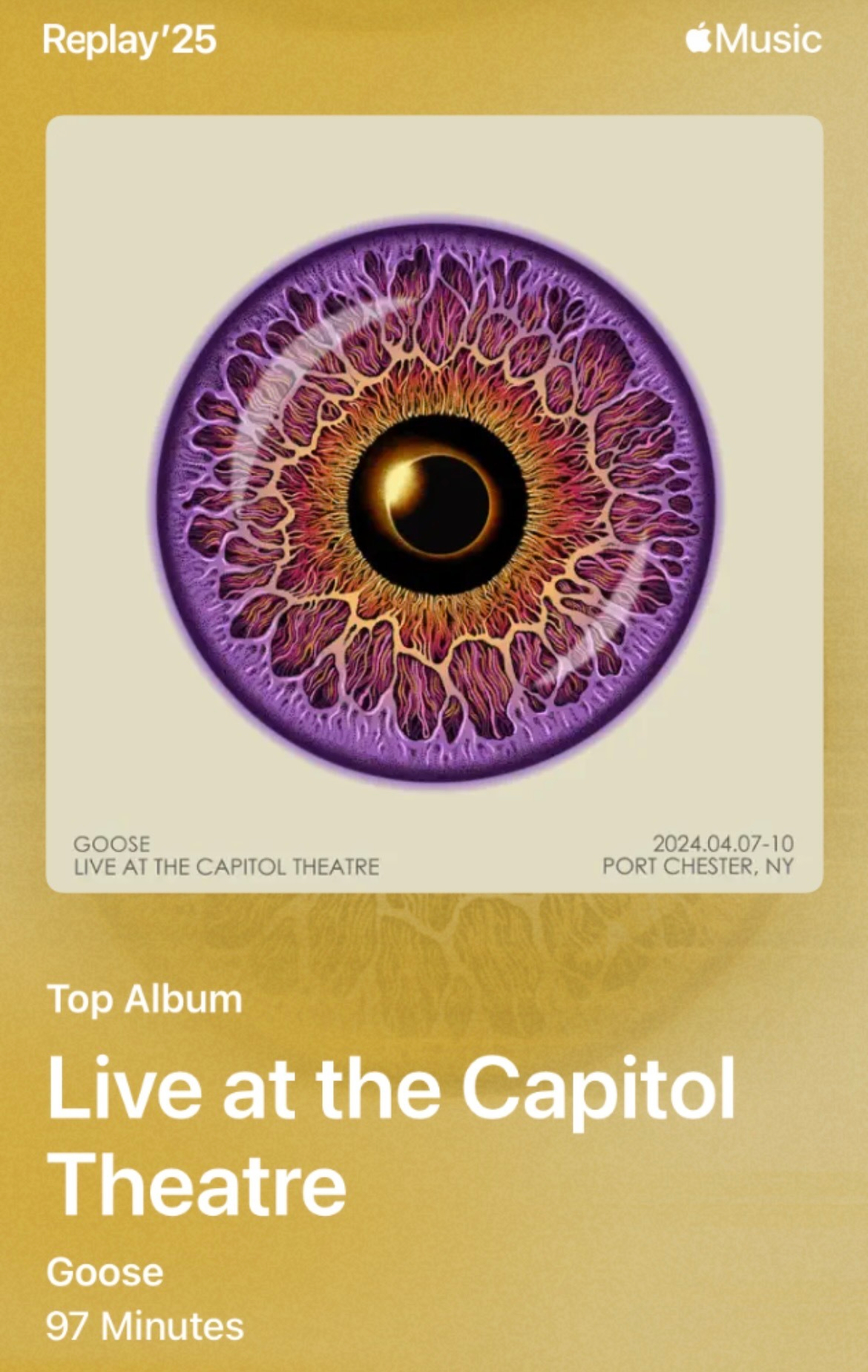 The most played artist for me in 2025 was Bohren & Der Club of Gore. I love having them on while I am reading in the evening. I got turned on to this unique jazz outfit from my student teacher last year and have written about them before. Apparently, I was one of their 500 top streamers in the world. Despite that, and despite my daughter listening to her favorite music on an iPad where she is signed in as me, rock music was my top genre. Not surprising. Goose was the top rock band that I listened two (after being my top overall artists that previous two years). Indeed, Goose was my top artist for four months this past year and their album Live at the Capitol Theatre was my top album overall. Taylor Swift topped my streaming in both February and October, though that was mostly my daughter. That said, I’ve got to admit that I like some of her music. C’est la vie.