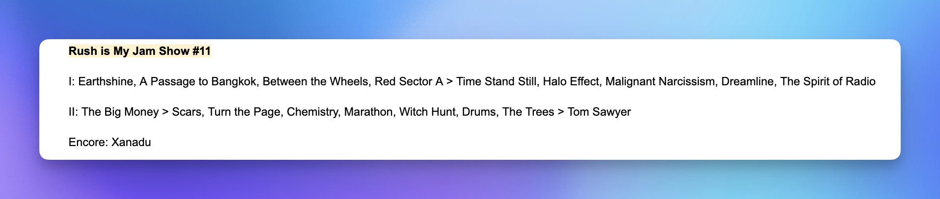 The ultimate imaginary Rush tour rambles on. Show #11 drops several of the major hits that would make most people very pleased. Tour rats who hit this show would be rewarded with the first Halo Effect of the tour. Xanadu encore would be epic, as would a Big Money set two opener. That tune always ripped my face off in real life.