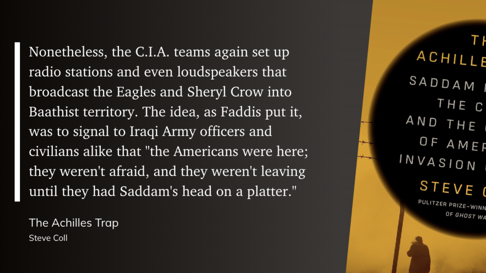 I finished Steve Coll’s The Achillies Trap last month. Good book. Readwise reminded me last week that I had saved the quote below about the use of music by the C.I.A. prior to the 2003 invasion to signal to Iraqi generals that the United States was ‘around.’ It reminded me of the story of how the C.I.A. used music both to help capture Panamanian dictator Manuel Noriega (Bush the Elder) and to torture prisoners at Guantanamo Bay during the administration of Bush the Younger. Metallica’s Enter Sandman was apparently a favorite. According to Sgt. Mark Hadsell of the 361st Psychological Operations Company, “If you play it for 24 hours, your brain and body functions start to slide… that’s when we come in and talk to them.” This practice, of using western music as torture, eventually led to a Freedom of Information Act request by many artists who wanted to know if their music was used and why it was chosen. Interesting list of artists.