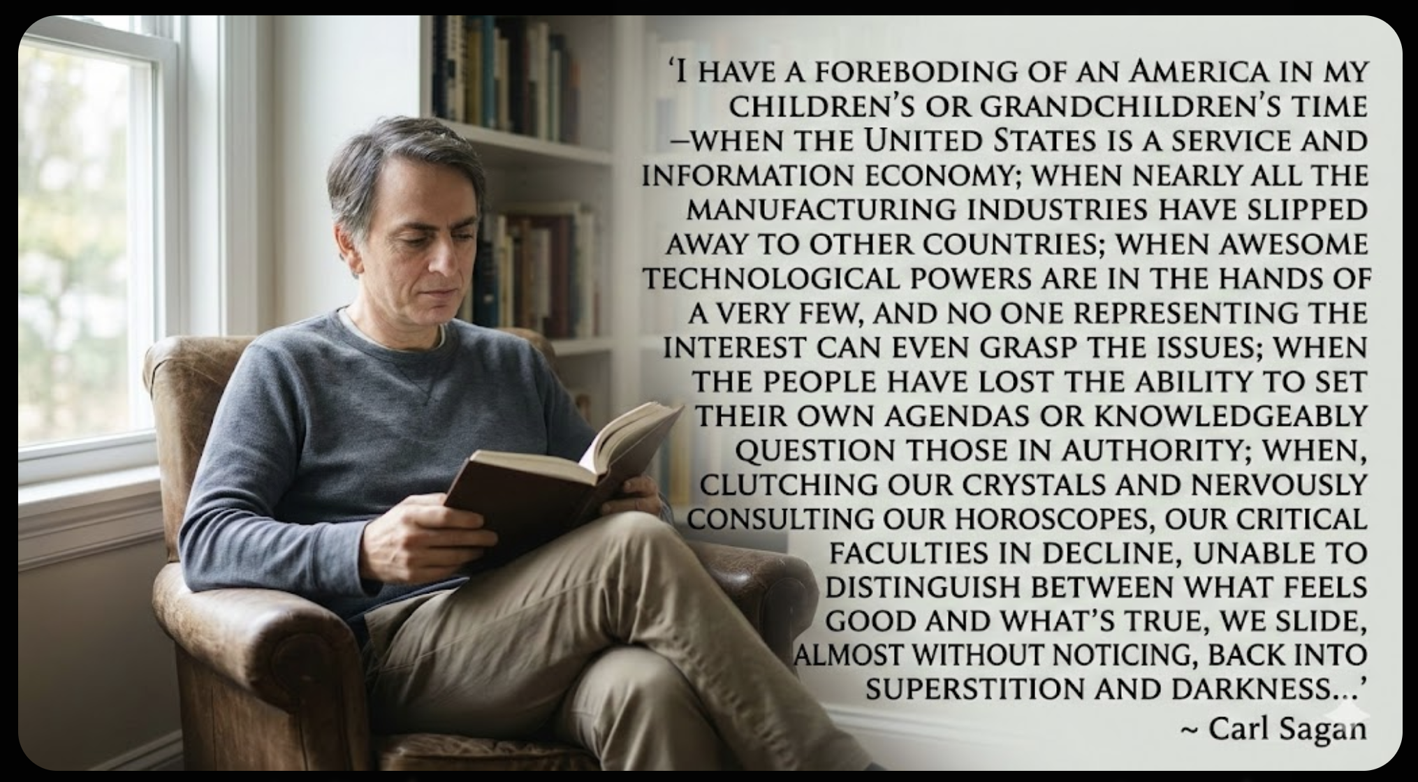 I have been sharing a quote of the day with my students since I started teaching in the late 90s. Consequently, I am a collector of quotes. This one from Carl Sagan, from a book of his published in 1996 called The Demon-Haunted World: Science as a Candle in the Dark seems relevant. I’m filing this under ‘Great Sentences’ (and ‘Prescience’).