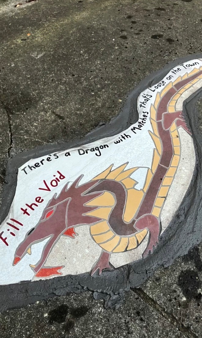 This morning I came across this cool story in The Oregonian. Apparently there is a mysterious group in Portland that is beautifying public spaces by creating little pockets of artful color and beauty where there are cracks on the ground on roads or sidewalks. They have an Instagram account titled @fillthevoidpdx.