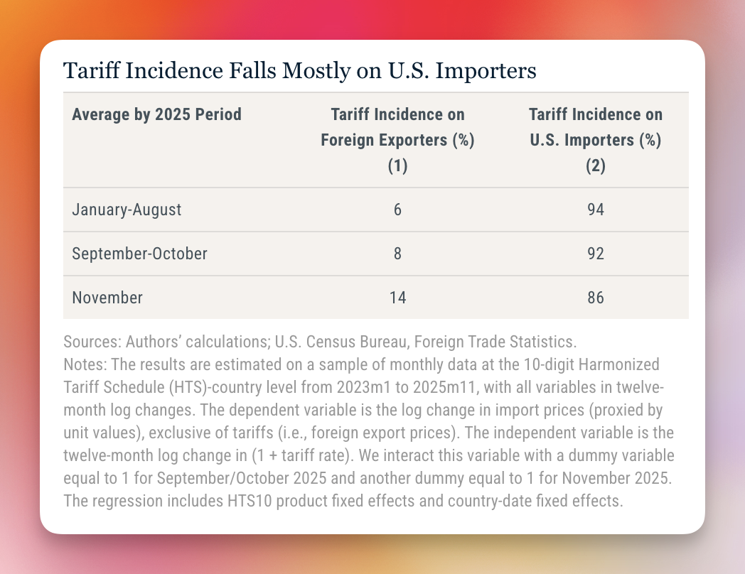 More specifically, the New York Fed study reveals that the vast majority of the economic burden from the 2025 U.S. tariffs (nearly 90 percent!) is being borne by domestic firms and consumers rather than foreign exporters. Apparently, while the average tariff rate spiked from 2.6% to 13% over the year, foreign exporters generally did not lower their prices to absorb the cost. Instead, these costs were passed through to U.S. importers, leading to an 11% increase in prices for goods subject to the average tariff.