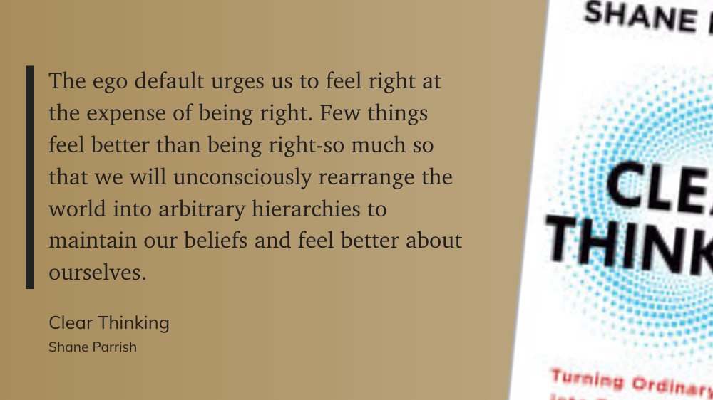 We all know the pull of wanting to be right, especially in the always online world many of us inhabit. It can be intoxicating. In a heated conversation, whether in person or online, the moment we sense our position getting battered, something inside resists; not because truth is at stake, but because our ego is. Shane Parrish–author, podcaster, and clear thinker extraordinaire–calls this the “ego default,” the drive to feel right at the expense of actually being right. I’ve felt it in staff meetings, political arguments with friends, and even small family squabbles. Hell, I even argue with myself while I am reading. Self-righteousness is deeply alluring.