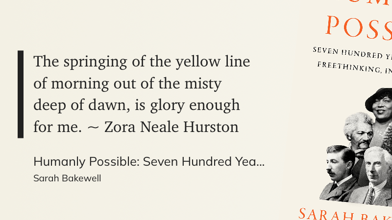 Sarah Bakewell’s excellent book Humanly Possible is a great history of humanism. It is a history book, but it also is a book about a philosophy. Zora Neale Hurston was a writer I was first introduced to in college, when I was assigned her book Their Eyes Were Watching God. Little did I know at the time that Hurston was a free-thinker, which is why this quote showed up in Bakewell’s book. I thought it was both a beautiful sentence and a beautiful sentiment as soon as I read it. No need to make things up when reality is amazing enough.
