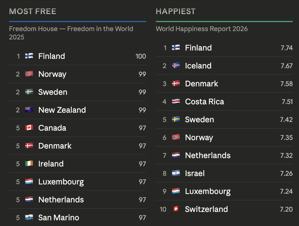 Below are the top ten lists from Freedom House and from the 2026 World Happiness Report.