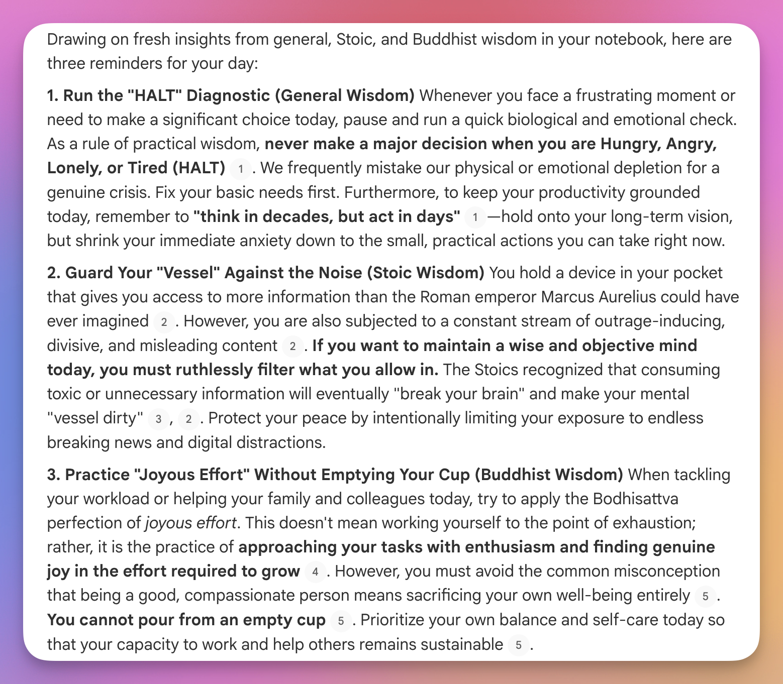 I shared before that I use Notebook LM (on most days) to provide myself with highly curated daily reminders. Yesterday I spent some time building a new Notebook LM that includes curated ‘reminders lists’ from smart people like Morgan Housel. I then used Notebook LM to distill the various lists into a ‘study guide.’ I then shared that study guide with my already created ‘Buddhist and Stoic Wisdom" notebook that I use for my daily reminders.