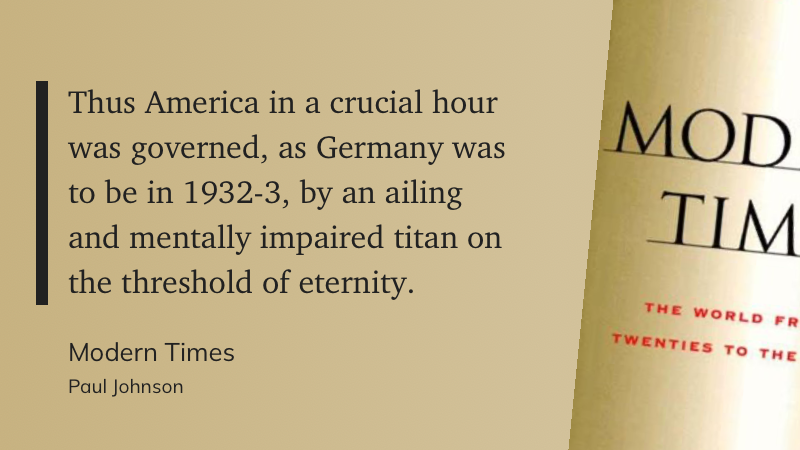 During that time, his second wife, Edith Wilson, became a sort of shadow president. Indeed, he had only just married Edith in 1915, so she had only been the first lady for four years when this all went down. I was aware of this episode from my reading of A.Scott Berg’s biography of Wilson, but was reminded about it recently while reading Johnson’s book. Indeed, I make a point to teach this strange episode to my students.