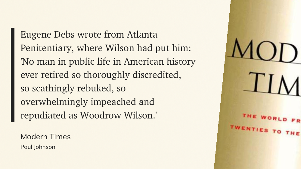 The quote below is from Johnson and it is what sparked this post. Not only do I think it is a great sentence, but I just taught the Treaty of Versailles last week so Wilson was top of mind. The second quote below from Johnson’s book shines a light on another noteworthy event in Wilson’s administration–the jailing of Social Eugene Victor Debs for speaking out against the war. Debs ran for president from jail in 1920 and garnered slightly less than a million votes. His disgust with Wilson is understandable. Debs, luckily for him, was pardoned by the winner of the 1920 election, Warren Harding.