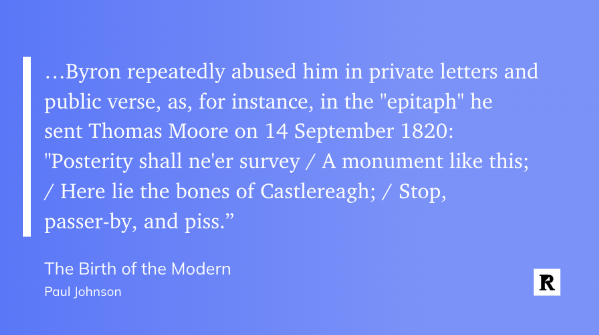 I came across a rather 19th century zinger that I also thought was clever. This one comes from the profligate and licentious poet Lord Byron about British politician Lord Castlereagh. Pretty good as insults go, no?