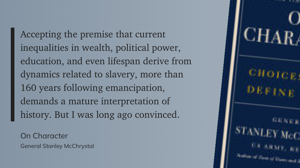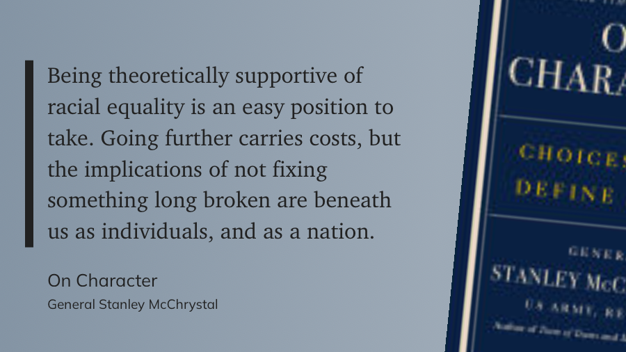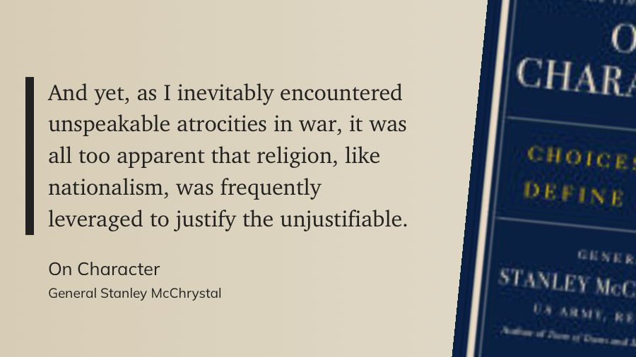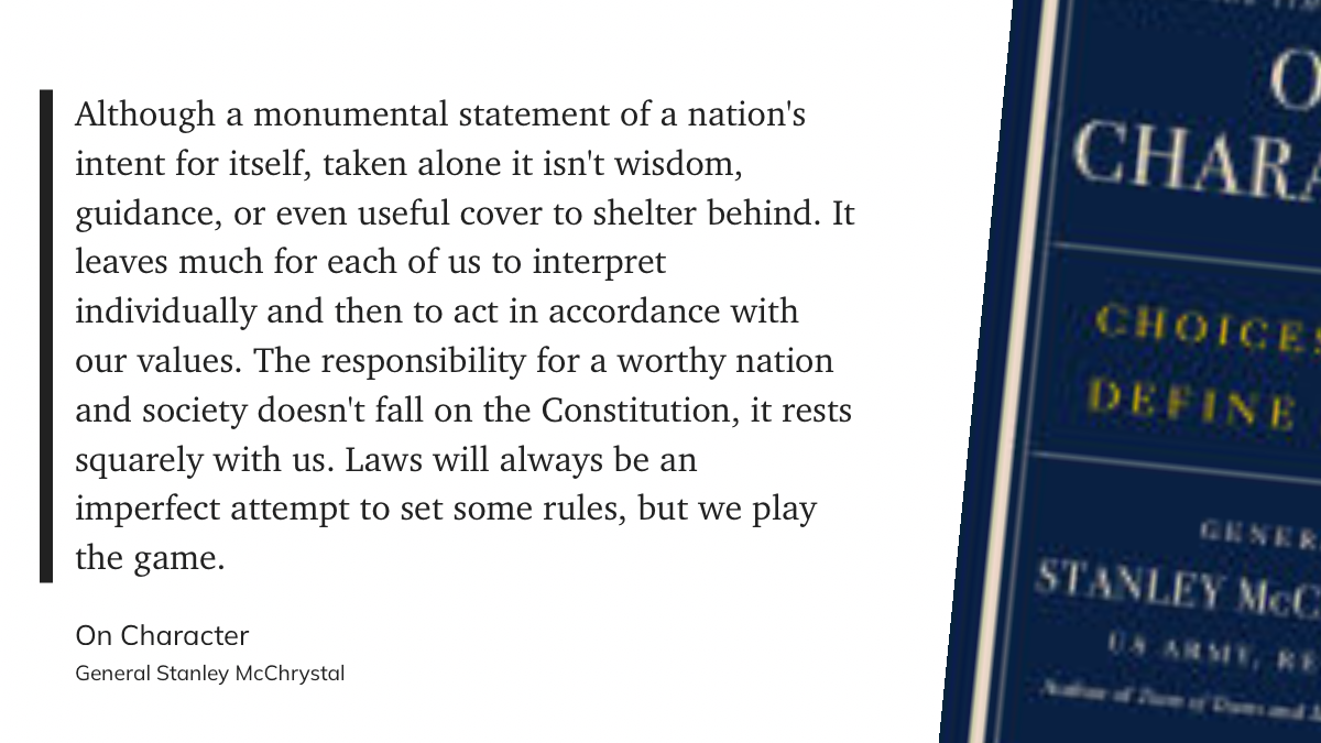I am currently reading his book On Character and enjoying it very much. McChrystal is clearly a thoughful guy and not easily pigeonholed. I find myself agreeing with most of his takes on the big issues he discusses in the book. Below are some of his thinking, which I found insightful and wise. The quotes are about religion (1), race (2 & 3), and the Constitution (4).