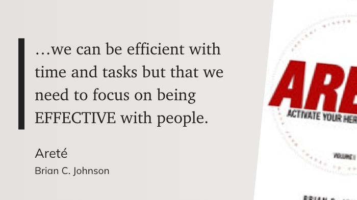 This quote hits hard for me. As a high school teacher, I am all about being efficient with my time due to the challenges of teaching (interfacing with 150 teenagers every day, email, planning, grading, hiking across campus just to make copies, dealing with all the other teacher admin we need to deal with–you get the idea). However, I find that I always feel rushed when talking to people individually outside of class and often give both students and colleagues less than my full attention. I know that is not ideal. After such an interaction, I can usually feel that I was not fully present and it leaves me disappointed. I saved this quote while reading Arete’ because it is a solid reminder that I need to reframe how I interact with people one-on-one at work. I’m still learning, and some days are harder than others, but I am getting better. I have come to realize that what’s true of productivity is also true of people: sometimes you’ve got to slow down in order to speed up.