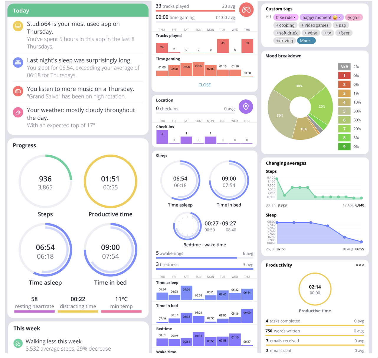 The reason for this post is a newer app I’ve added to the mix: Exist. It recently had a thoughtful refresh and has become a solid addition to my tracking system. With Exist, I can score my days from 1 to 9, add tags, and review insights it generates from my inputs. I’ve found it useful for giving each day an overall grade and spotting the factors that shape whether it feels good or bad.
