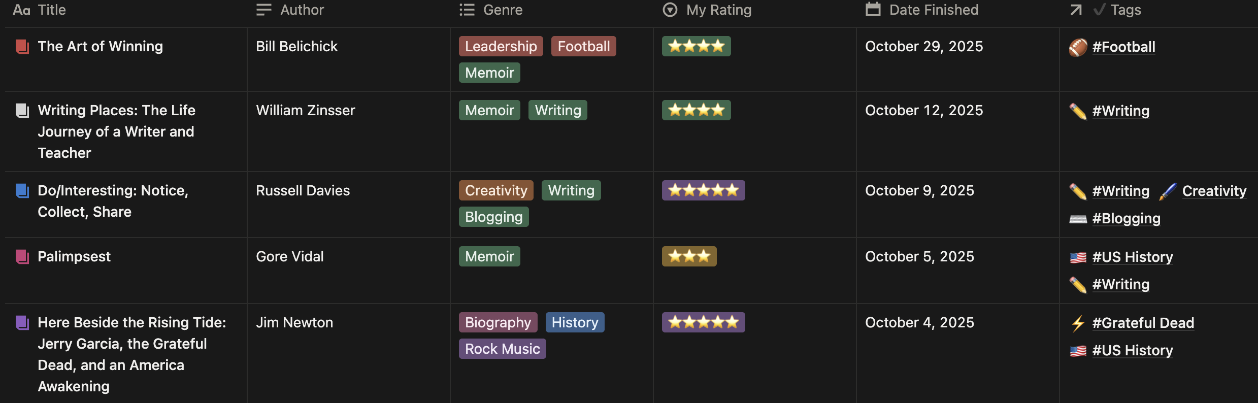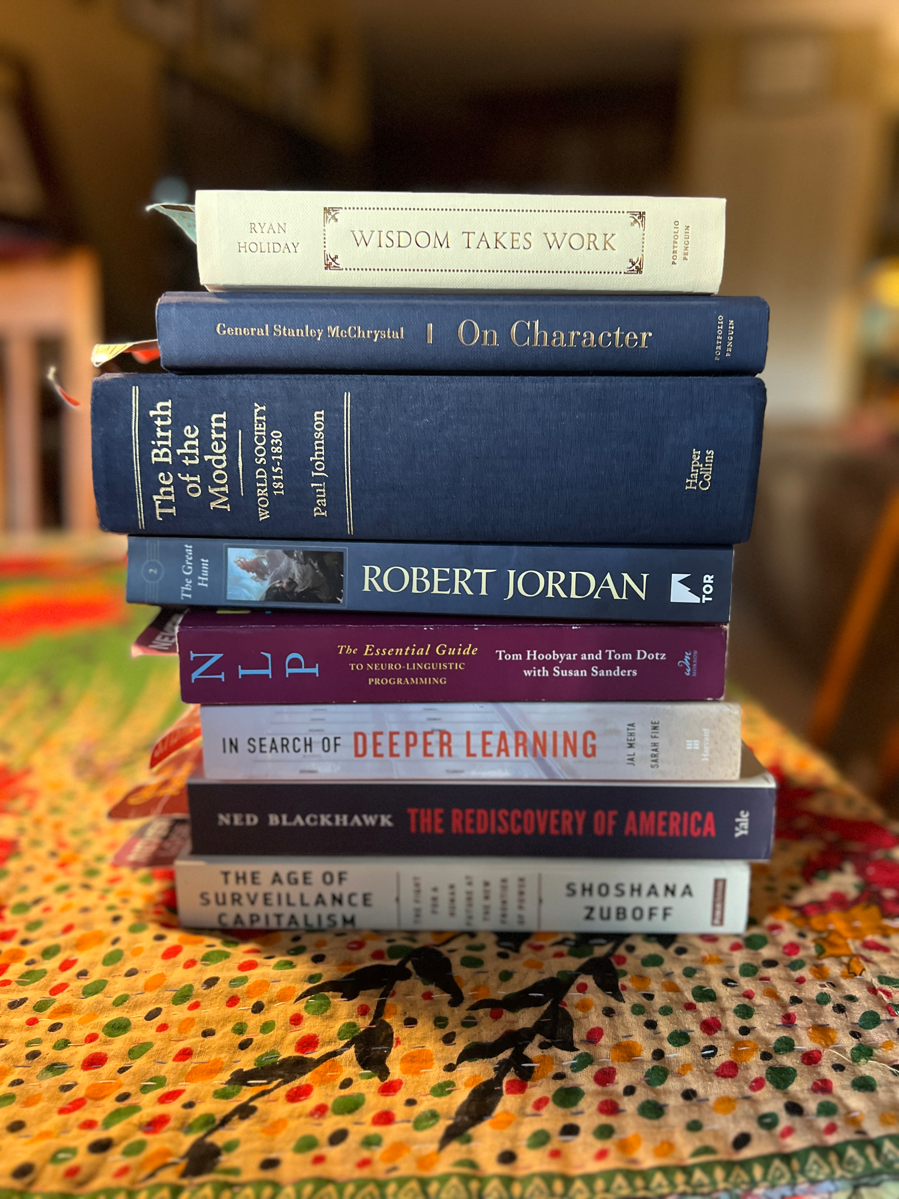 Here is my current reading stack. Most recently started books towards the top, slogs at the bottom. I finished five books this month, all of which I enjoyed. However, a few of my current reads are languishing. For instance, I don’t think I picked up Zuboff’s book more than once this month. I am also not digging into the textbook I started at the end of the summer (not pictured here). This is pretty typical for me though. I dip into four or five books every day and two or three are read every day and allow me to make progress much faster. The Birth of the Modern is a doorstopper and has been sitting on my bookshelf since the 90s, when I got the book off the remainder table at Tower Books. So far I am really enjoying it and I suspect I’ll be done with it early in the new year. The Stanley McChrystal and Ryan Holiday books go well together and I am enjoying them both. However, The Rediscovery of America is a slog and is not as good as I’d hoped. Unlike the Zuboff book though, I am committed to finishing it.