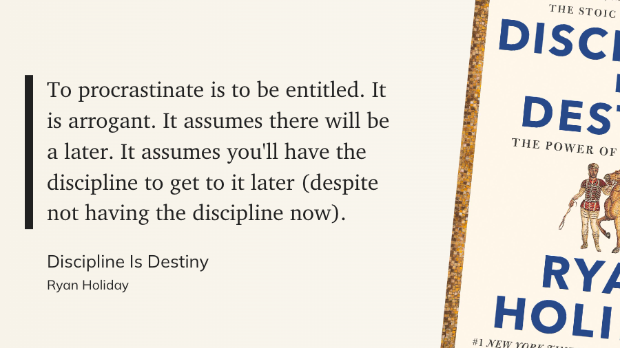I couldn’t save this quote into my second brain fast enough. It gets to the heart of the matter for me because it relates to the core Buddhist idea of impermanence. When I remember that nothing is guaranteed, not even tomorrow, it makes the decision to start today feel less like a burden and more like a responsibility. It is a fact that we could die at any time. Karma can shift on a dime. Most of us don’t think about that fact very often (that’s a whole other topic). Thus, Holiday is spot on; to put something important off because you think you will have time later is arrogant. It’s also true that if you lack the will and the discipline in the present, what’s to say you’ll have it in the future? For me, this shows up most clearly when I put off my short little home weight lifting protocol. I tell myself I’ll do it in an hour, but half the time it never happens that day.