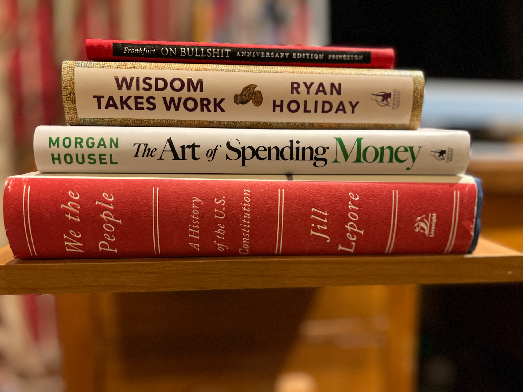The month is coming to an end and I treated myself again to some new books to add to my To Be Read collection. The Jill LePore book is very new and since I teach AP Gov it seemed like a must read. Her book These Truths is one of the best American history books I have ever read and I recommend it highly. On Bullshit always capatured my attention when browsing, but I never read it. This is the 20th anniversary edition so I suppose it is time to give it a go. At present, one’s bullshit detector needs to be a precise mental machine. The Ryan Holiday book is the last in his book series on the Stoic Virtues. Cannot wait to read it. Holiday’s writing is taut, packed with great stories, and full of wisdom. Morgan Housel’s book is also of very recent vintage. He does a great job of explaining the timeless truths about money and human psychology.