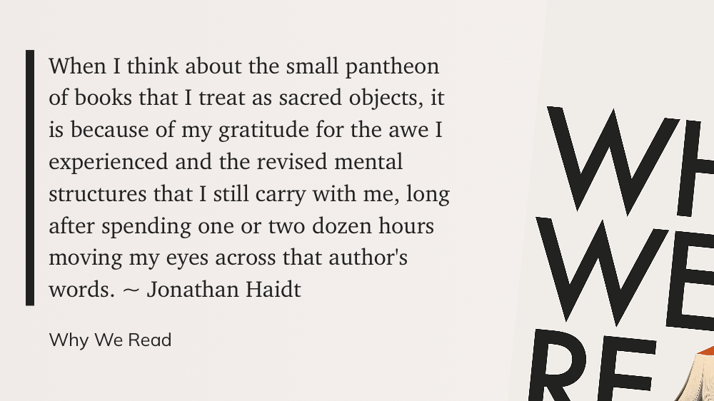 This quote by psychologist Jonathan Haidt expresses an argument for reading that I agree with. If I’ve picked my reads well there are many ideas that give me pause and help me understand both the world and my own views. Every once in a while, books themselves–in their entirety–permanently rearrange the mental structures in my mind. For me, those powerful books include: 1. The Lord of the Rings 2. Eknath Easwaren’s The Dhammapada 3. The Hays translation of Meditations by Marcus Aurelius 4. The Social Construction of Reality by Peter Berger. Ken Wilber’s books, espcially A Brief History of Everything, The Marriage of Sense and Soul, One Taste, and Up From Eden were also seminal and profound.