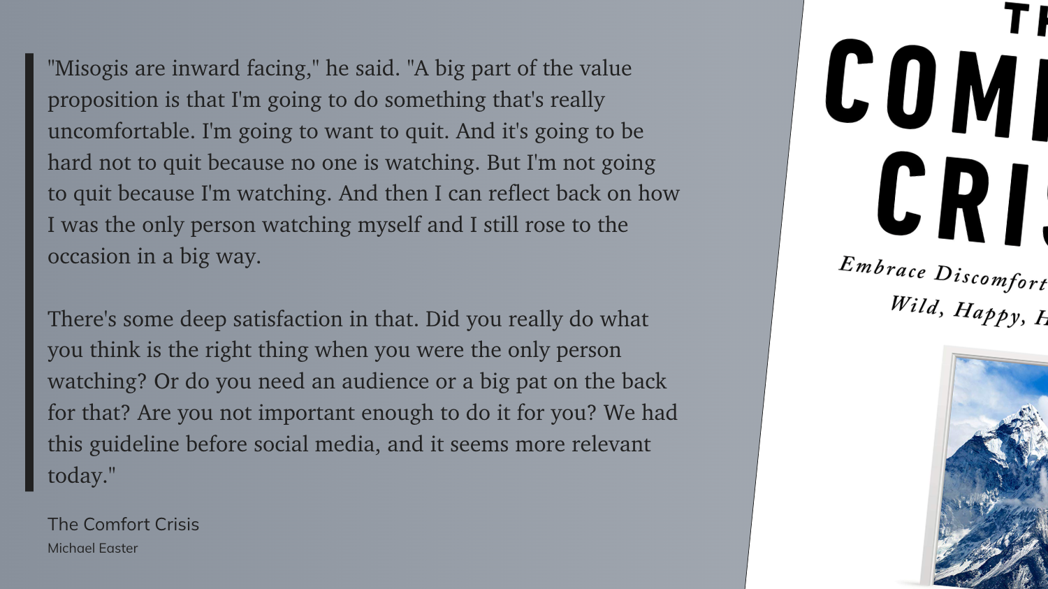 A misogi is a Japanese idea that has roots in Shinto purification practices. The idea is to ritually purify oneself by bathing in rivers, waterfalls, or the ocean. Samurai also adapted the practice to develop discipline, focus, and clarity. Writer Michael Easter wrote a great book called The Comfort Crisis. In it he adapts the idea of misogi to a modern western context. For Easter, a misogi is an epic personal challenge. He talks of scheduling one every so often, say every quarter or twice a year. I had never heard of the idea and can see why it is appealing.