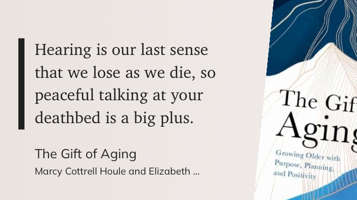 I am reading a book now called The Gift of Aging. In a chapter about the dying process the authors make the statement you can see below, that hearing is the last of the senses to fade during the death process. Digging in a bit, it seems hospice workers frequently notice that people who are dying and who seem unconscious often respond to the voices of their loved ones. This study supports these anecdotes.