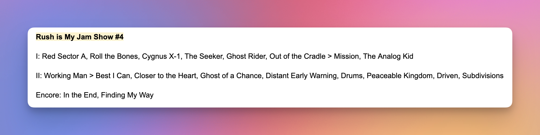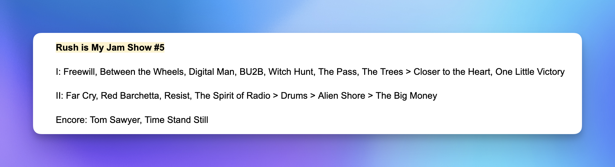 Rush Jam Show #5 has some heavy hitters. Best show yet? I always thought The Trees could be jammed out, and I think this first set combo would please the masses. Alien Shore is a hidden gem within Rush’s catalogue.