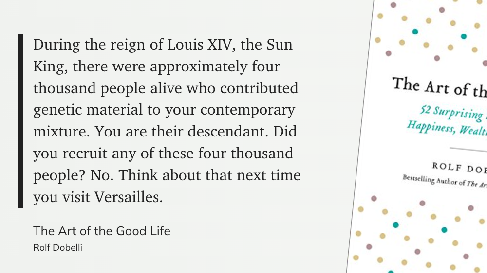 Perhaps this landed hard for me because I am not a scientist. When I came across this quote in Rolf Dobelli’s excellent book The Art of the Good Life I was stunned because it provides a glimpse into our personal history that I hadn’t thought about much before.