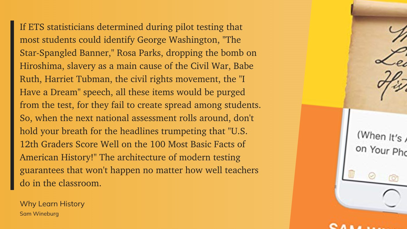 At the end of the day, as both a teacher and a parent, I don’t put too much weight into test scores. I’m not opposed to standardized tests, but I try to keep in mind Wineburg’s point, that there are reasons, often hidden, that weaken their ability to inform.