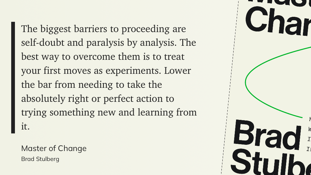 An idea that I have come across several times of late is the one shared by Brad Stulberg in his book Master of Change. Indeed, Ness Labs founder Anne-Laure Le Cunff wrote a whole book on the topic called Tiny Experiments, which I recommend.